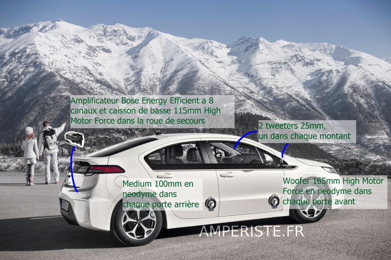 Comme beaucoup d'autres éléments de la Volt / Ampera, le système audio sera un peu particulier. Conçu par Bose, spécialiste reconnu des systèmes audio, il participera à l'efficience de la voiture.