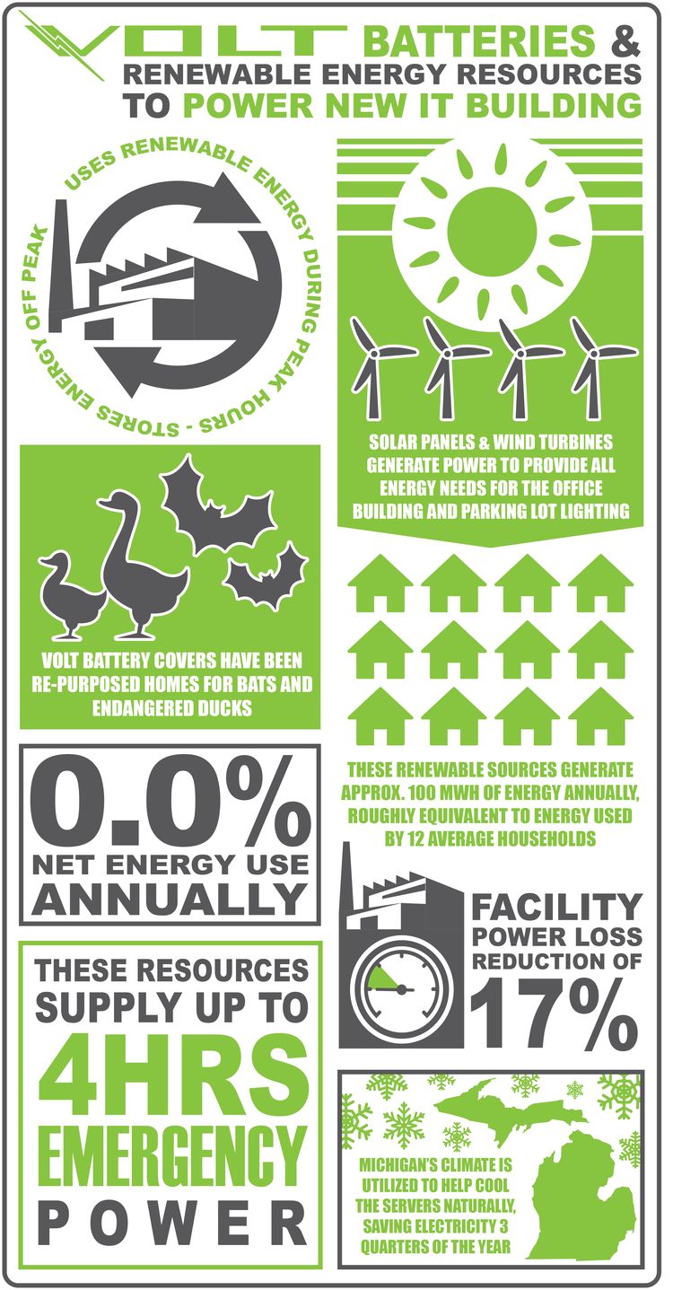A présent, il n'est plus question de recycler seulement les compartiments de batterie. Ce sont les packs entier. Ils prennent place dans des ensembles plus gros qu'une voiture. 5 packs de batterie de Chevrolet Volt sont regroupés pour former un ensemble pouvant stocker plusieurs dizaines de kWh. La première application est mise en oeuvre pour un batiment de General Motors, le DataCenter de Milton.